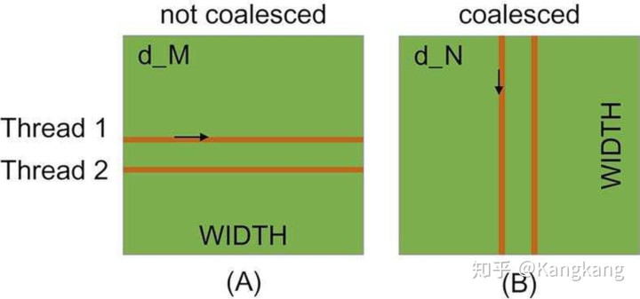 在上图中,矩阵M内存访问模式是低效的,而矩阵N的访问模型是高效的。