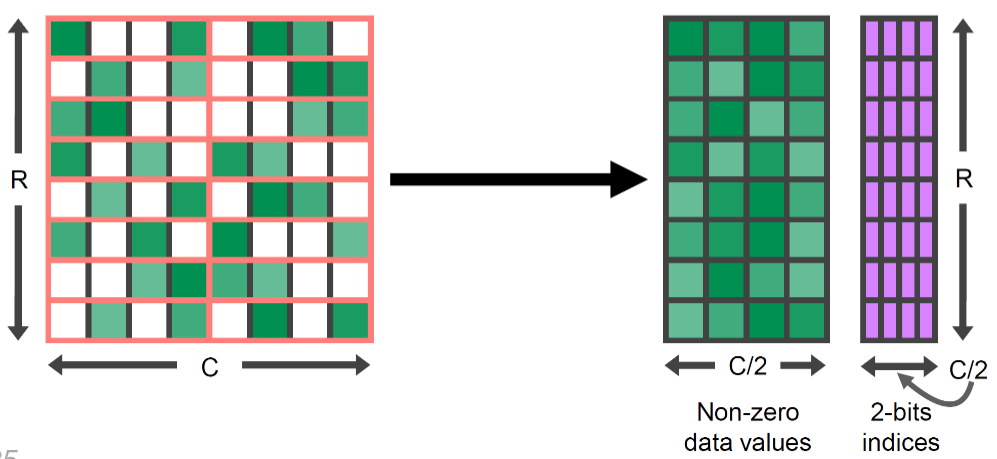 从Ampere架构之后,NV引入了Sparse Matrix。它的具体格式如下图所示: