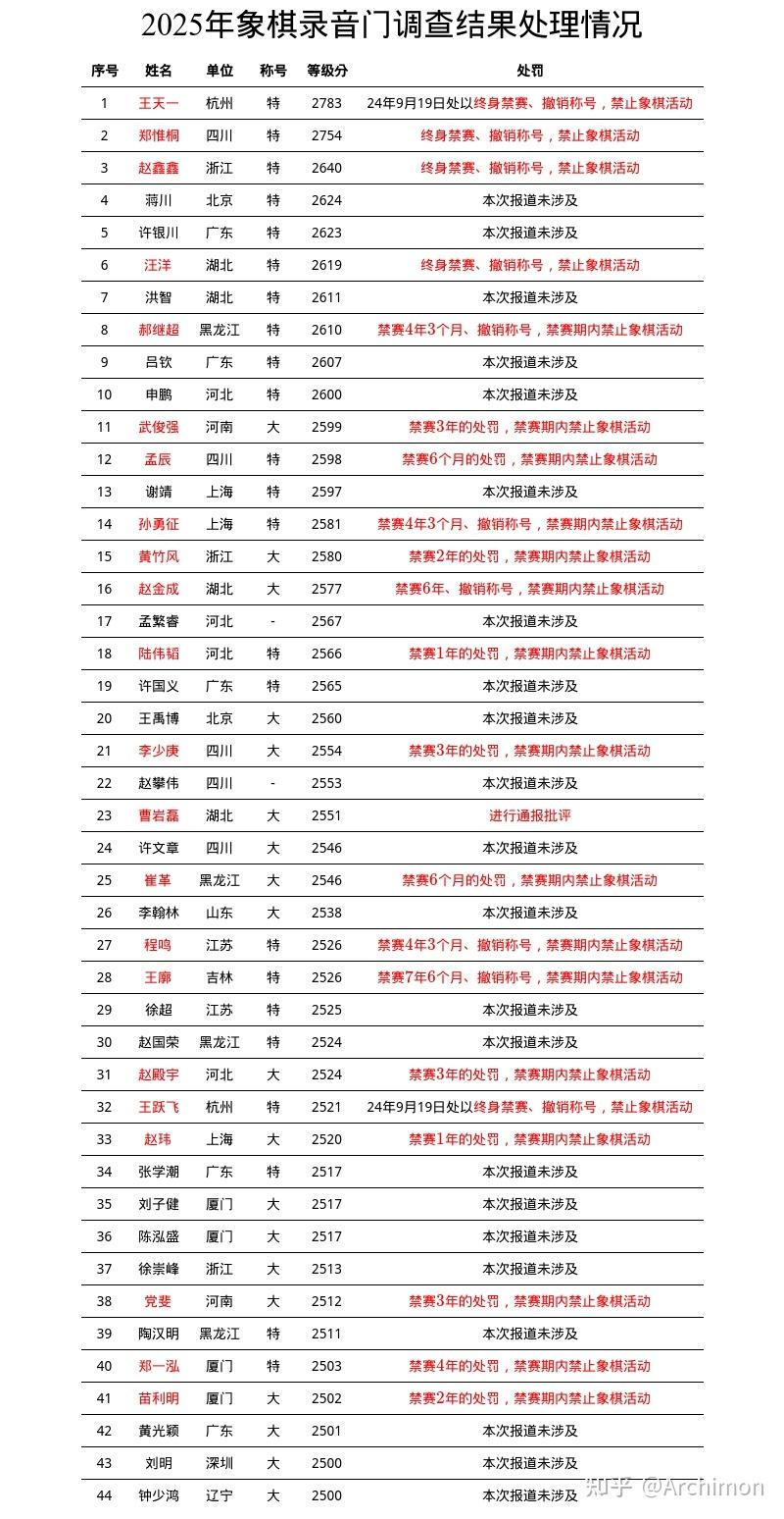 王天一终身禁赛+蹲监狱,郑惟桐等排行前几的几个人也终身禁赛(未来不排除蹲监狱的可能),排行靠前的特大基本都是禁赛四年甚至七年以上,排行中上游的大师们也禁赛了一大批,连看上去义正辞严的举报人党大师都一屁股烂事,被禁赛了3年。里面不仅有很多90~00年的中坚选手,还有68年的张申宏、81年的孙勇征、83年的苗利明、85年的郝继超这种知名度很高且早已过巅峰的老选手,以及两个未成年选手……